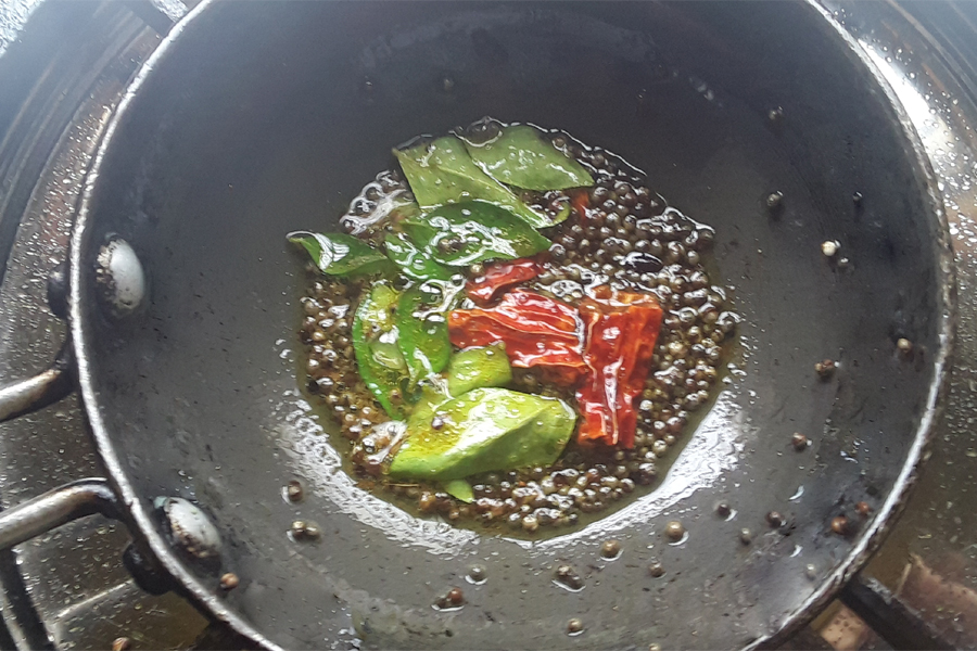 7. Heat 1 teaspoon oil in a tempering pan. Add ½ teaspoon mustard seeds, 1 pinch asafoetida. Let the mustard seeds splutter.