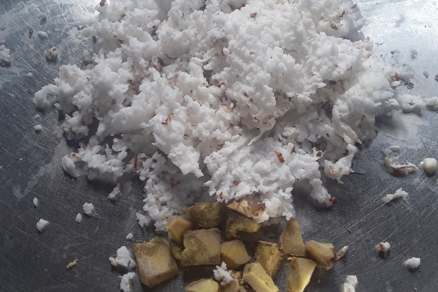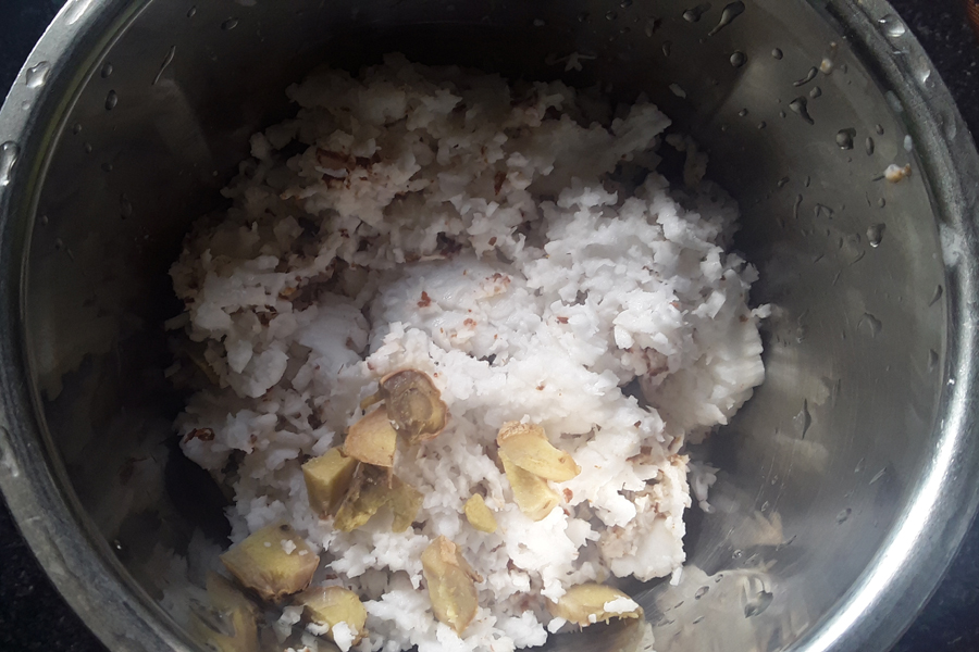 2. Add grated coconut, chopped ginger, and ½ teaspoon cumin seeds to a mixer jar.