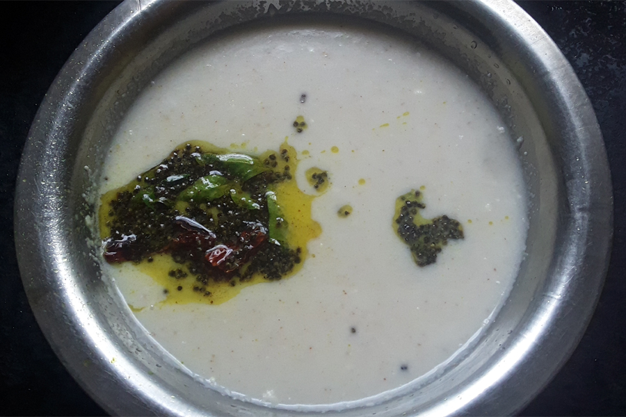 9. Switch off and pour the tempering over the tambli. Mix well and serve with hot rice.