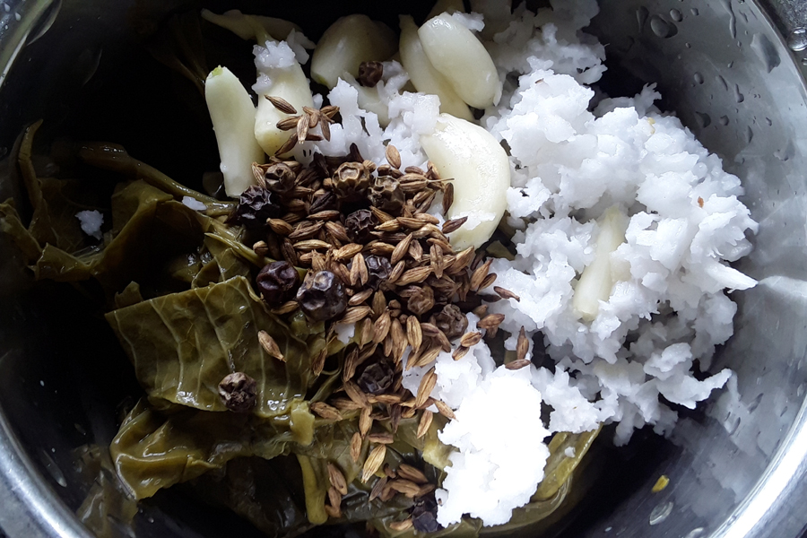 6. Take cooked kannekudi, grated coconut, roasted spices, garlic, and a piece of tamarind in a mixer jar.