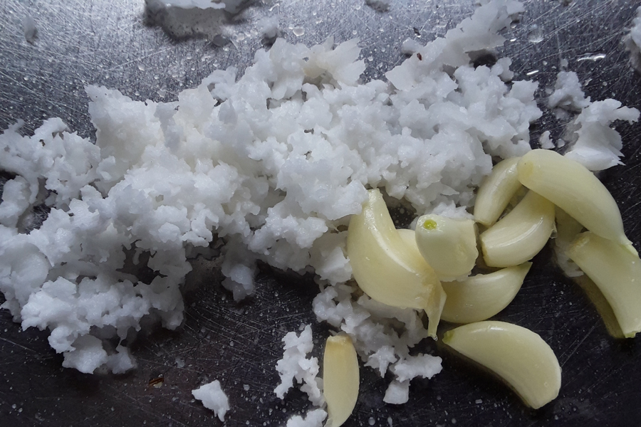 5. Grate 1 tablespoon fresh coconut. Peel garlic and wash them.
