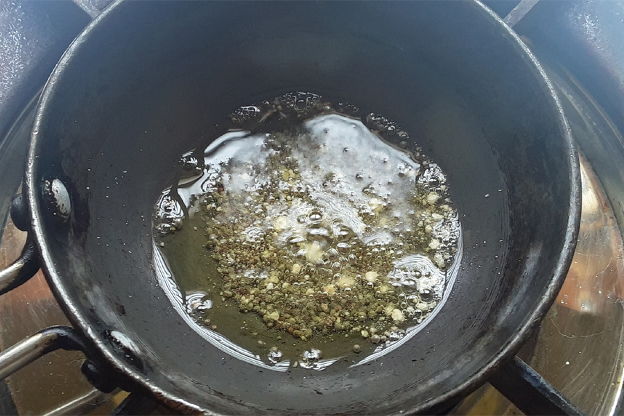 27. In a small pan, heat 2 teaspoons oil. Add 1/2 teaspoon mustard seeds. Let them crackle.