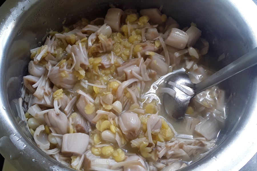 18. Once the lentils are cooked to a soft texture, add cooked jackfruit and mix well.