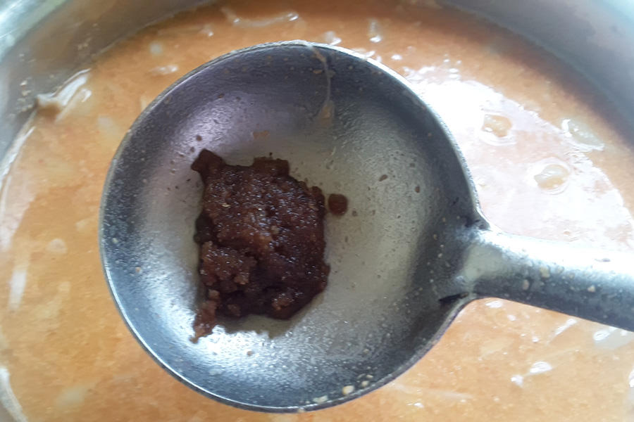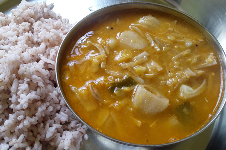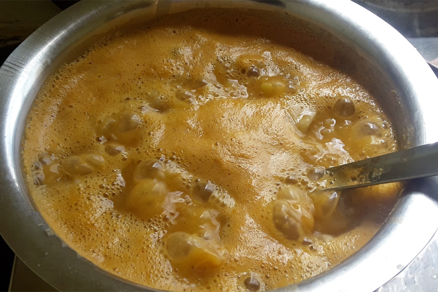 This amazingly tasty jackfruit Huli or stew is made by slow cooking the tender jackfruit and pigeon pea lentils to a soft texture, and then mixed with ground spices. This is similar to any regular huli, but fewer spices are used to keep the jackfruit flavor enhanced. Jackfruit should be tender that you should be able to cut through the seeds easily to make this Huli. Tough, brittle, or ripe jackfruit cannot be used to make Huli.