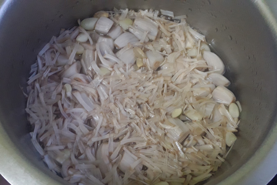 9. While the lentils and jackfruit are cooking, heat 1 teaspoon of oil in a thick pan on a low heat.