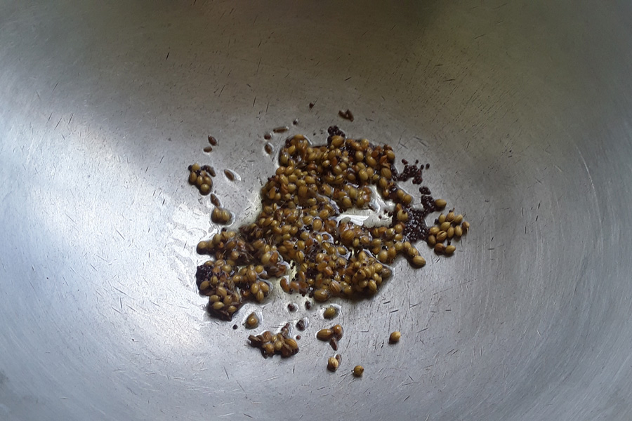 10. Add 1.5 teaspoon coriander seeds, 1/2 teaspoon cumin seeds, 1/4 teaspoon fenugreek seeds, 1/4 teaspoon mustard seeds.