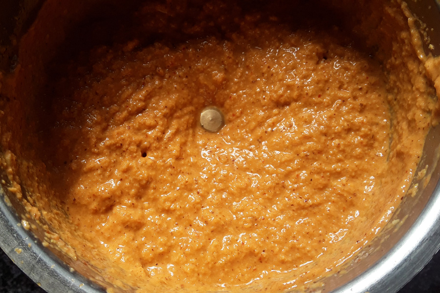 20. Add 1/2 cup water in a mixer or grinder jar. Swirl and shake the jar so that the spice paste at the bottom and sides of the jar gets mixed with the water.