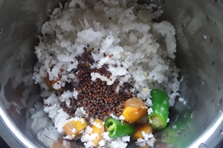 1. Grate ¼ cup fresh coconut. Roughly chop 1 green chilli, and turmeric root.