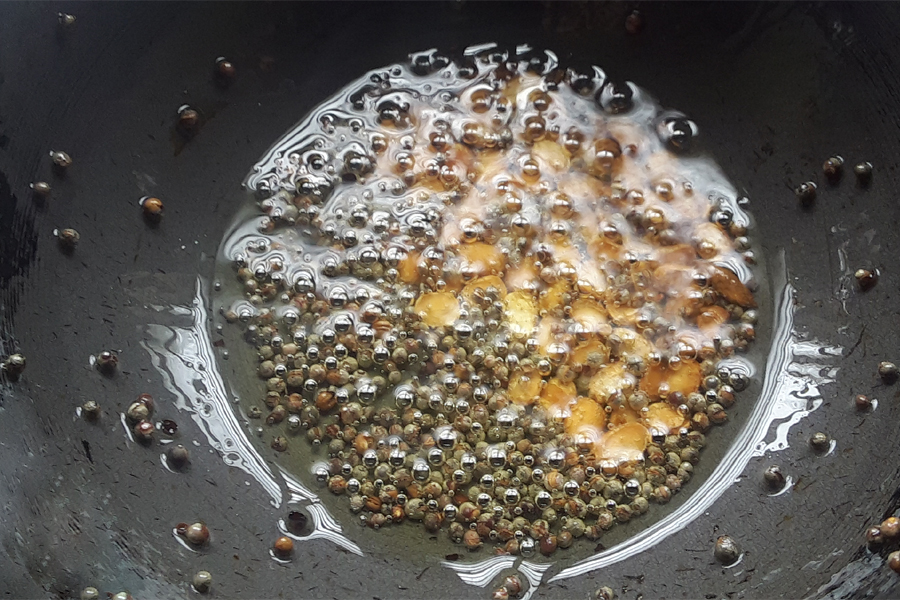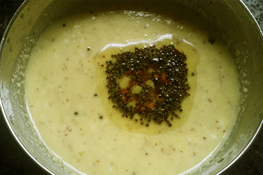 10. Heat 1 teaspoon oil in a pan, add ½ teaspoon husked split black gram (uddina bele or urad dal). Then add ¼ teaspoon mustard seeds. Let them splutter.