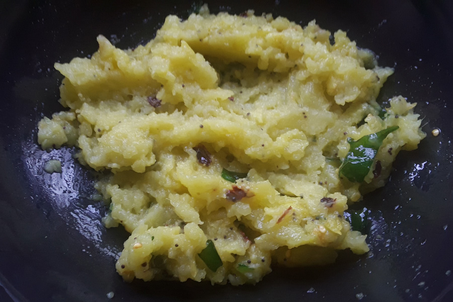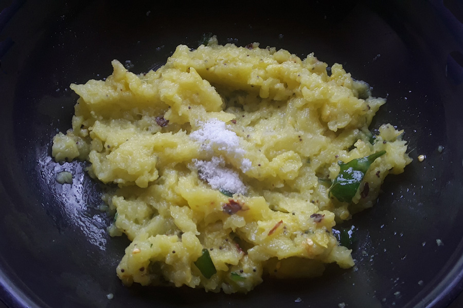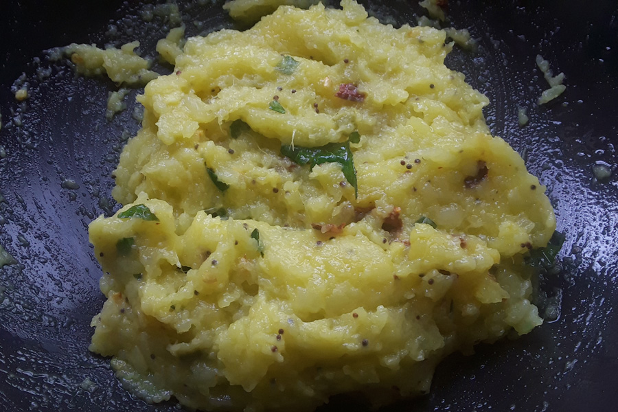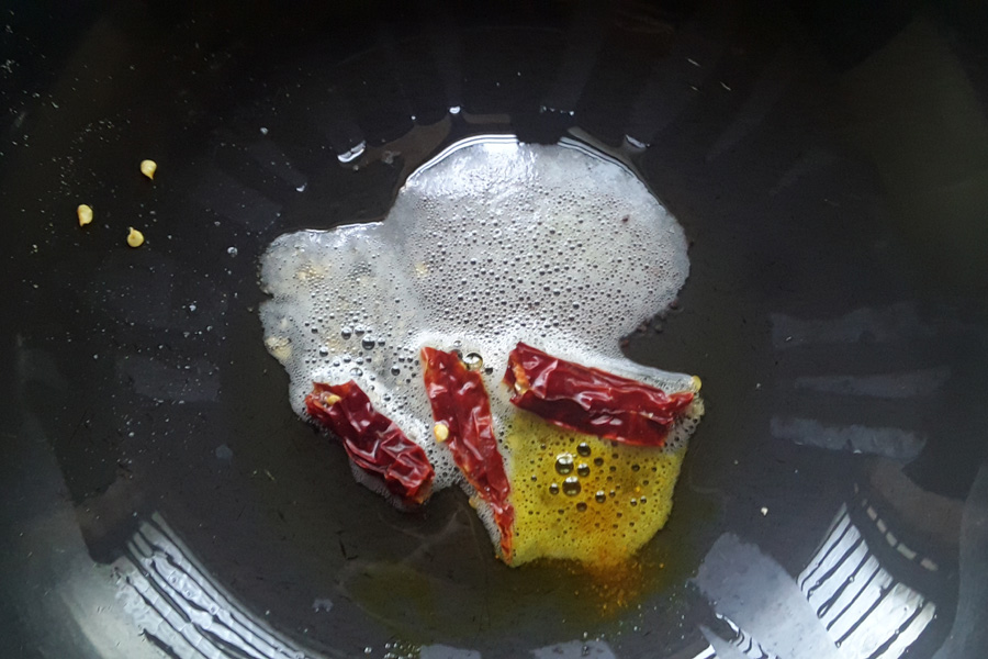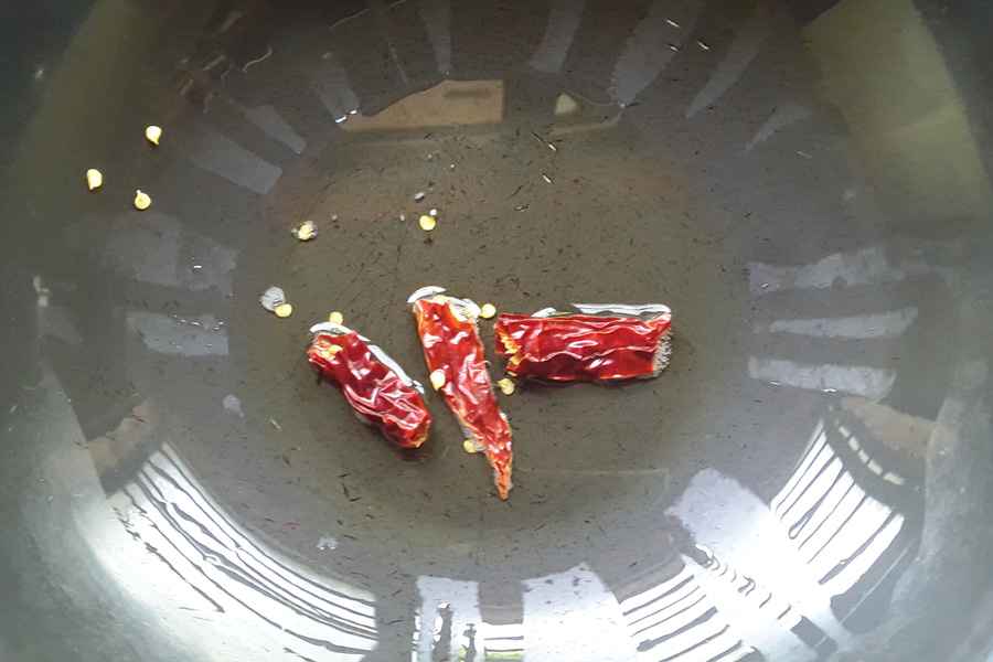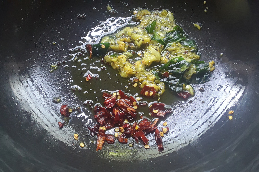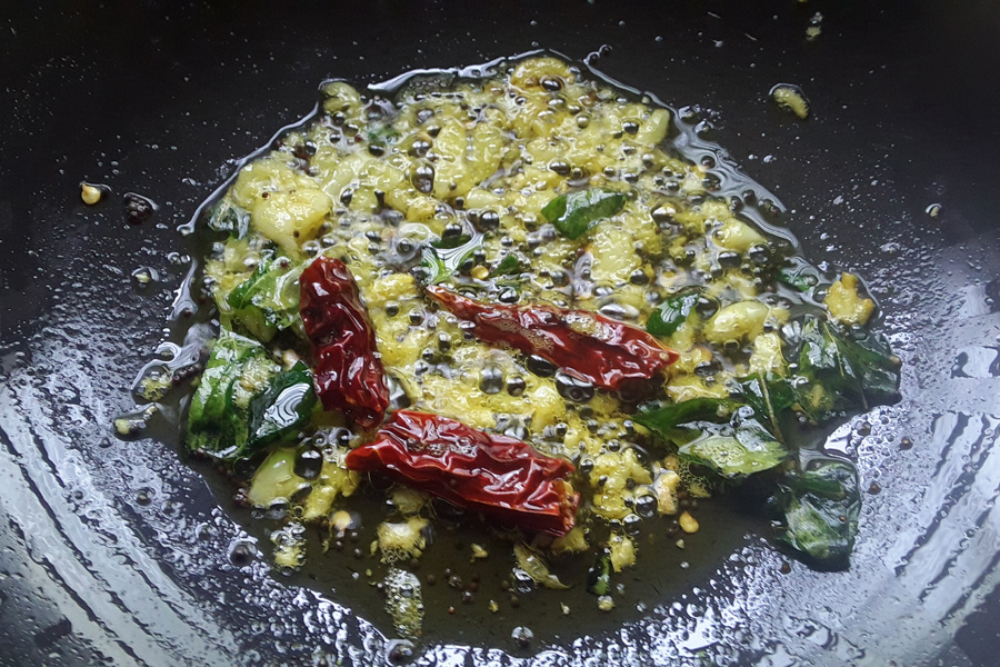 10. Add smashed garlic, and curry leaves. Fry until red chillies and garlic become crisp.