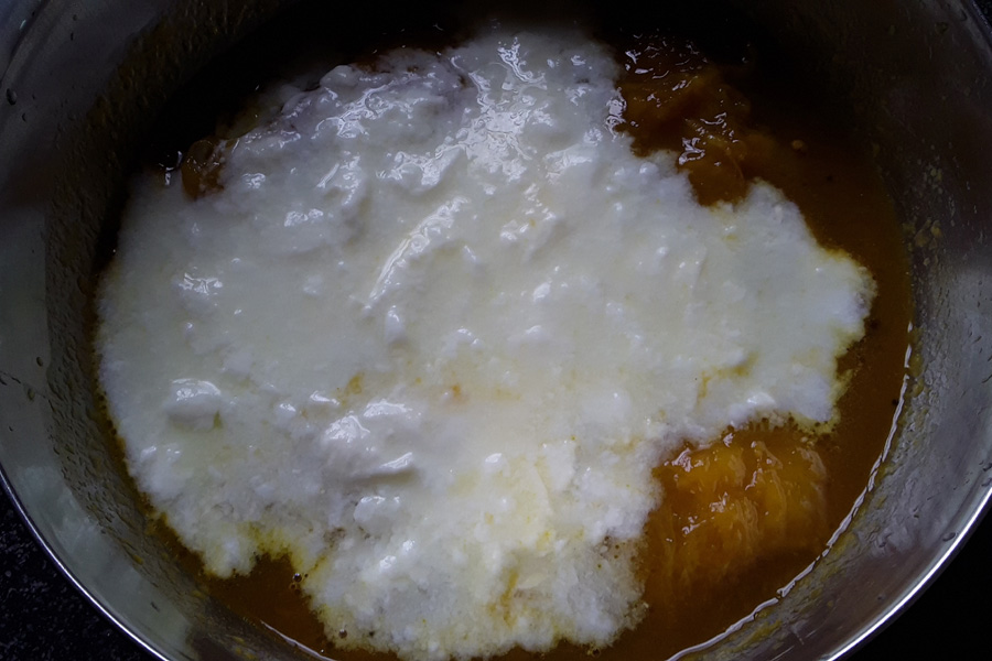 8. Now, add ground coconut, and ½ cup curd. Mix well.