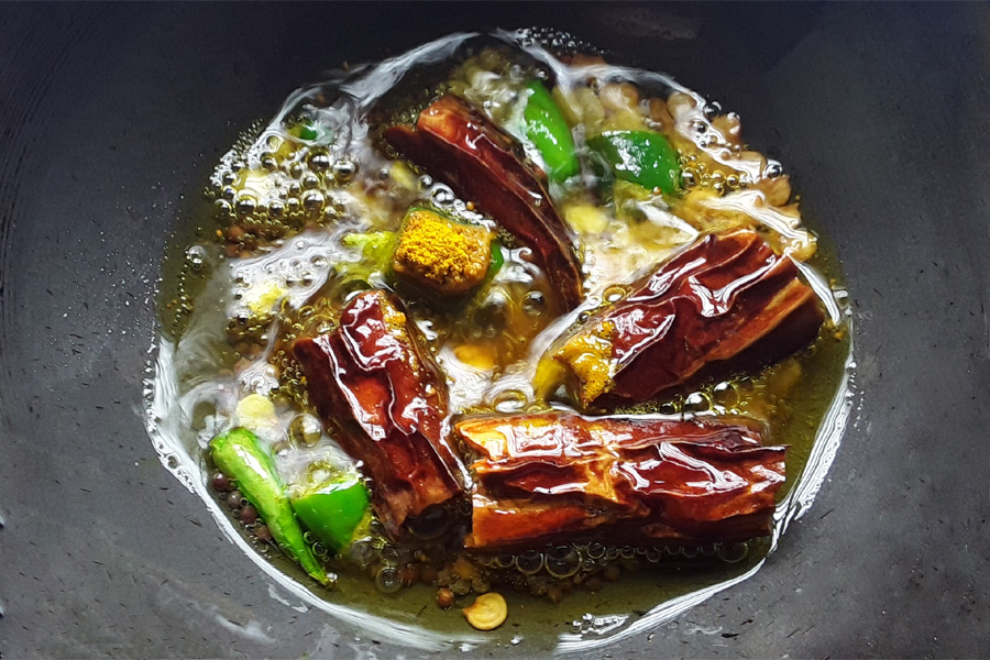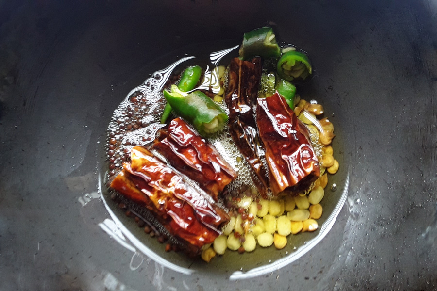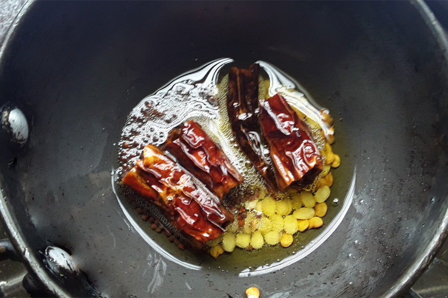9. Heat 1 teaspoon of oil in a small pan. Add ½ teaspoon husked split black gram, ½ teaspoon mustard seeds, and roughly pieced dry red chilli.