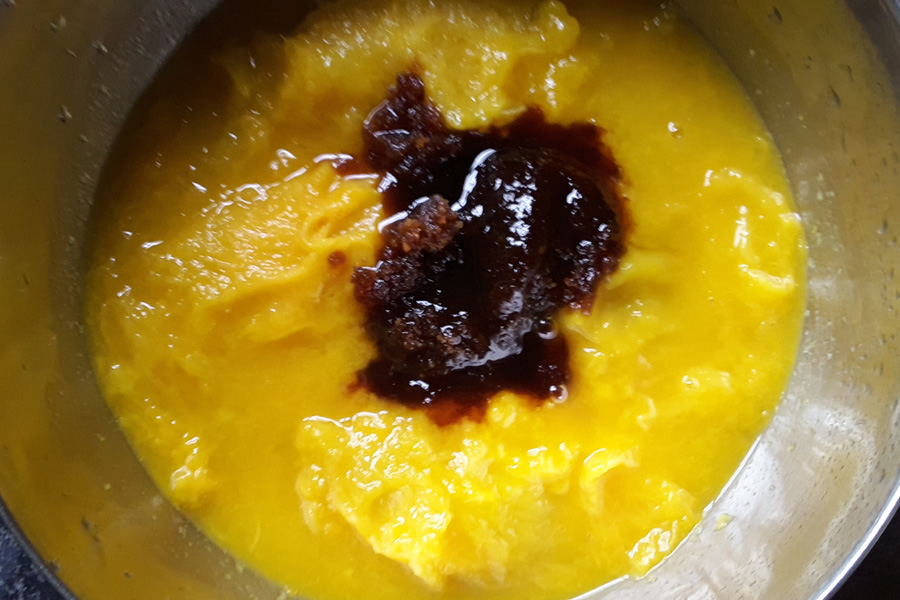 Sasime is a flavoursome dish with mixed taste and is served with plain rice. Sasime is made with specific mangoes called sasime hannu, and gets its mixed taste with the ingredients jaggery, curd, chillies, and of course mangoes itself. Ground coconut is also added to sasime to enhance its texture and the taste, but this is optional.