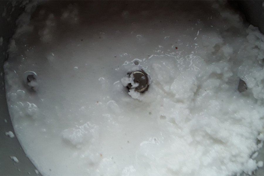 2. Take the grated coconut in a mixer, add water as required, and grind to a smooth texture. Cover and keep aside.