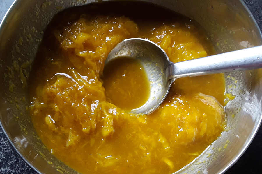 5. Squeeze the mangoes to take out the juice in a bowl. Keep the seeds as well.