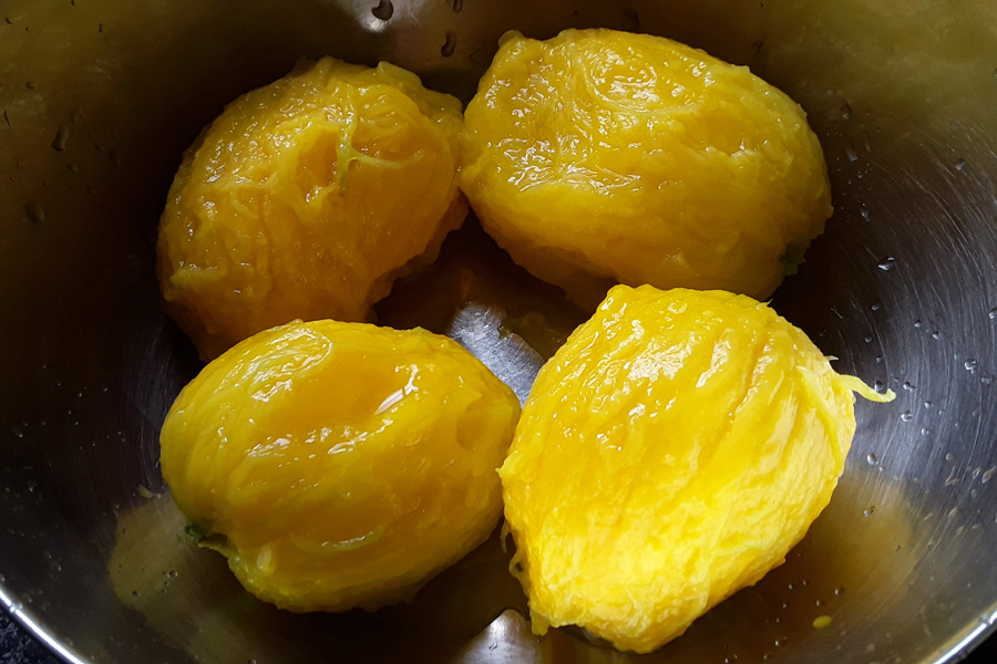For this recipe, you should get at least 1.5 cups pulp from 4 sasime mangoes. If not, add more mangoes.