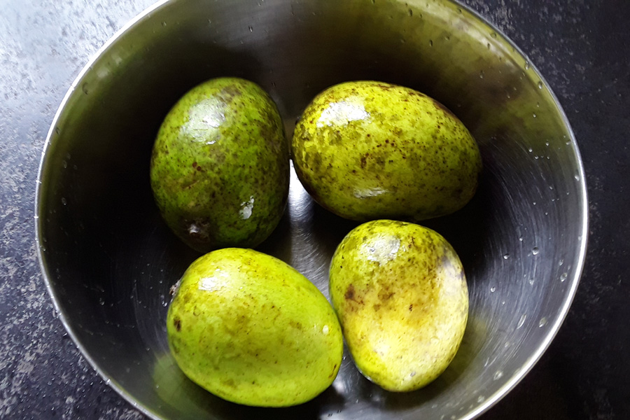 Hannu means fruit. Mangoes that are used for making sasime are called sasime hannu. These mangoes are usually very small in size and the skin is green even for ripe ones. No one plucks these mangoes, but picks from the ground when mangoes are dropped from the tree. Basketful can be collected 2 to 3 times a day. Generally, this is a task for children at home. Apart from making savory sasime, these juicy mangoes can also be consumed as-is.