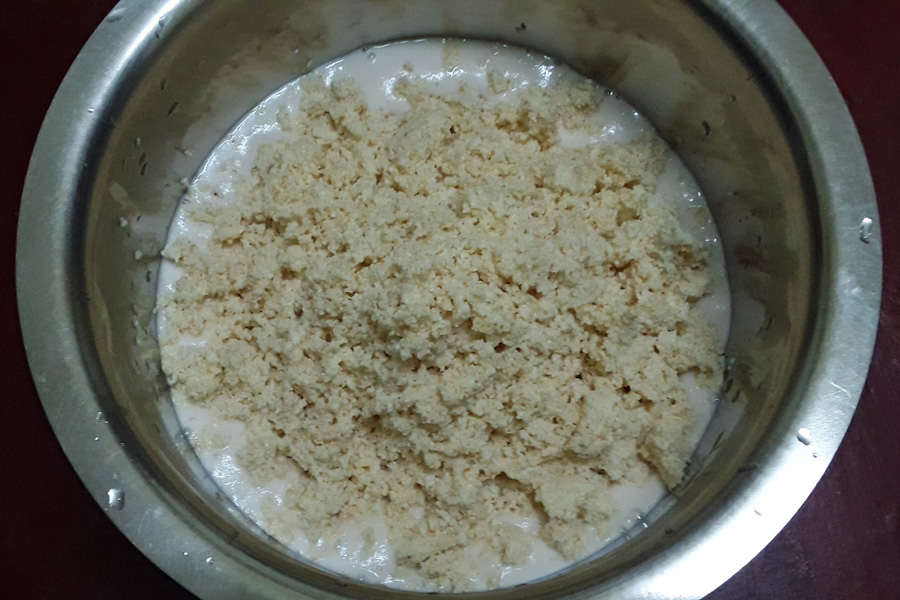 8. Take some portion of kesar rava in your palm and squeeze it to take out all the water. Add this squeezed kesar rava to the lentil batter. This way squeeze the entire kesar rava and add to the lentil batter.