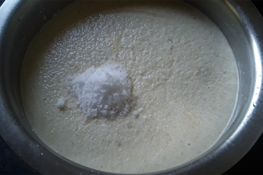 26. Add salt to the fermented idli batter, mix well, and pour in a wide bowl.