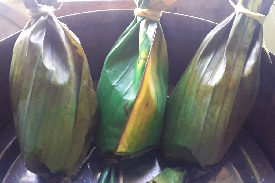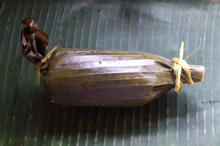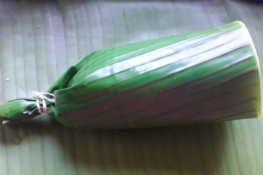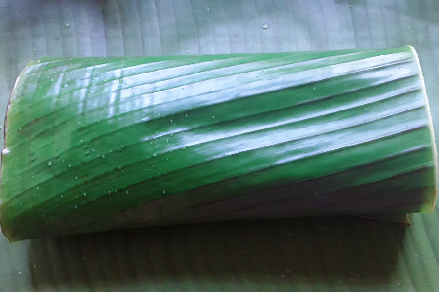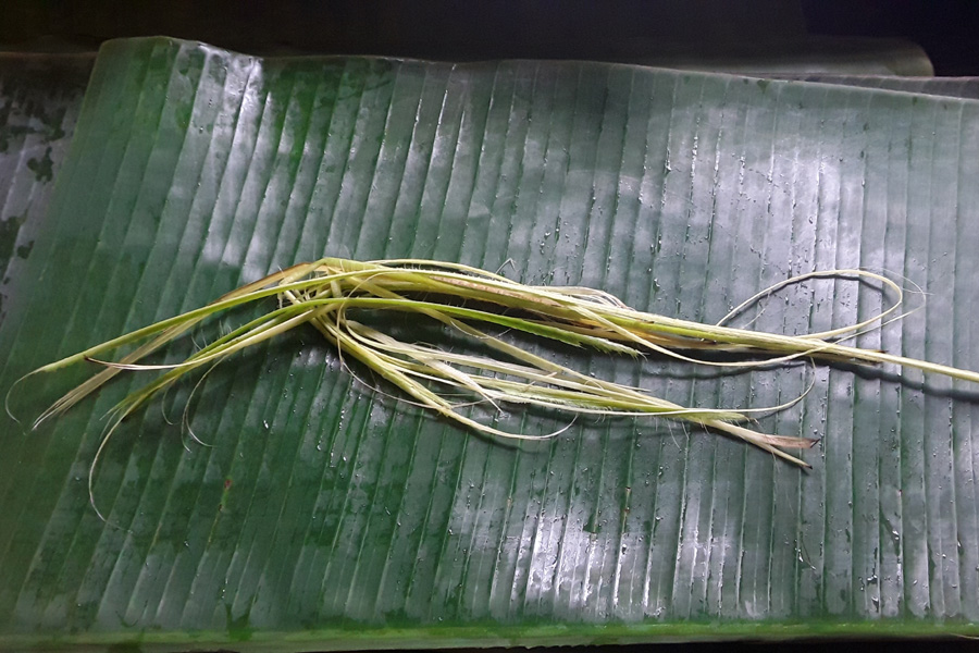 Take 3 medium or 5 small sheets of banana leaf. Keep the thread (banana leaf fiber) when you cut the banana leaf.
