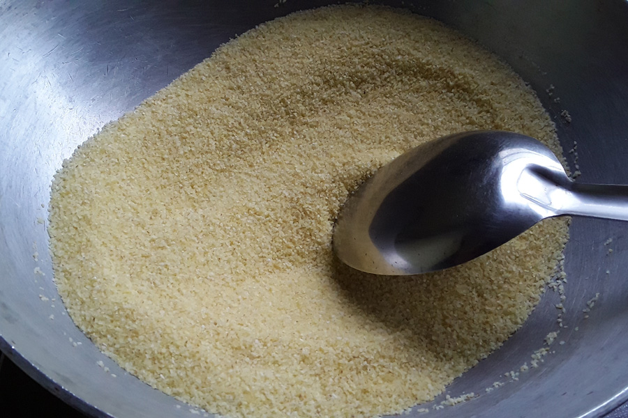 Roasting kesar rava takes about 8 to 10 minutes depending on the thickness of the pan and the flame. Let it cool.