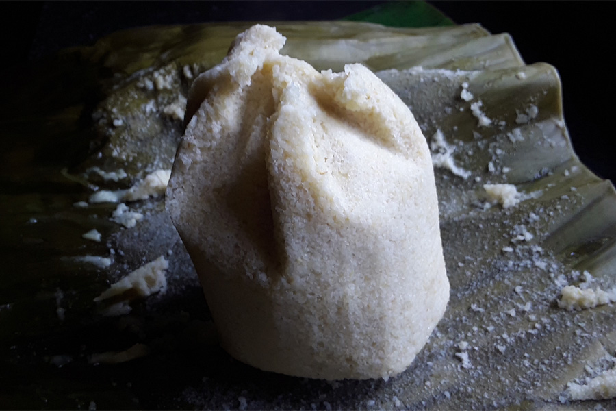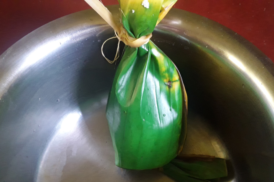 20. Leave some space and tie at the other end of the kotte. A little space is left as idli will increase in size once cooked.
