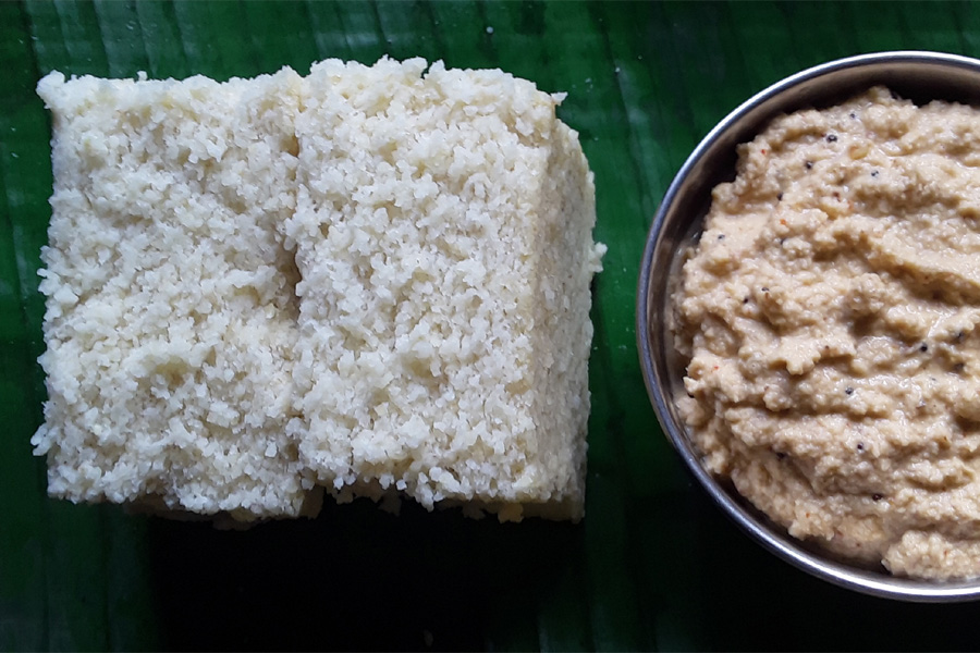 25. Serve idli hot or warm with coconut chutney or huli (samber / lentil-vegetable stew).