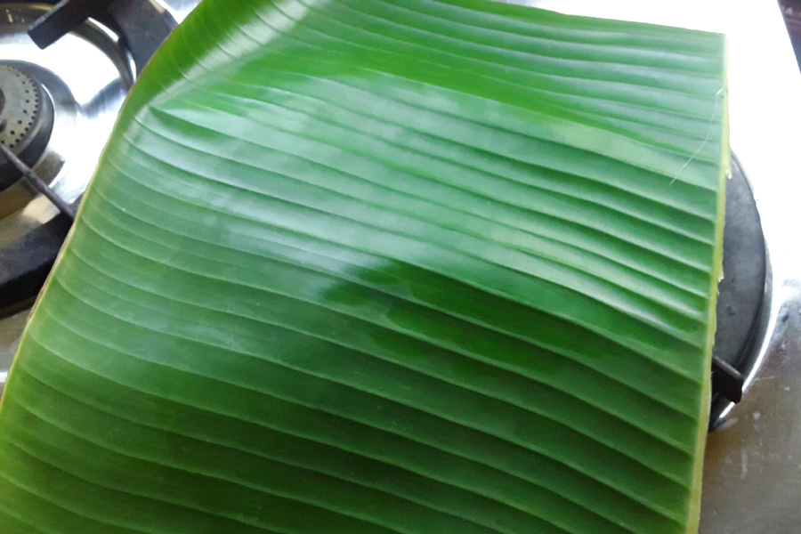 Observe that as soon as you pass banana leaf over a flame it starts changing the colour and will become shinier. Move the leaf constantly and quickly and do not burn.