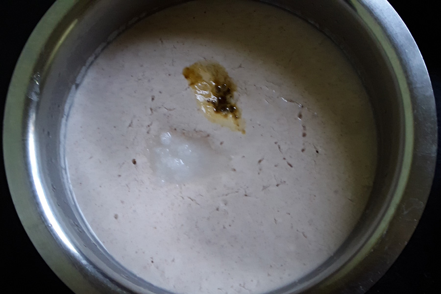 8. Next morning or before making tellevu, add 1/4 teaspoon jaggery, and salt as required. Mix well.