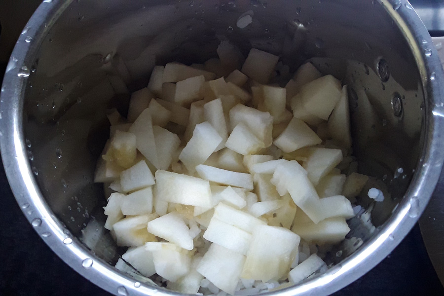 Adding water depends on type of rice used and how juicy Mogekaayi is. So add water in phases.
