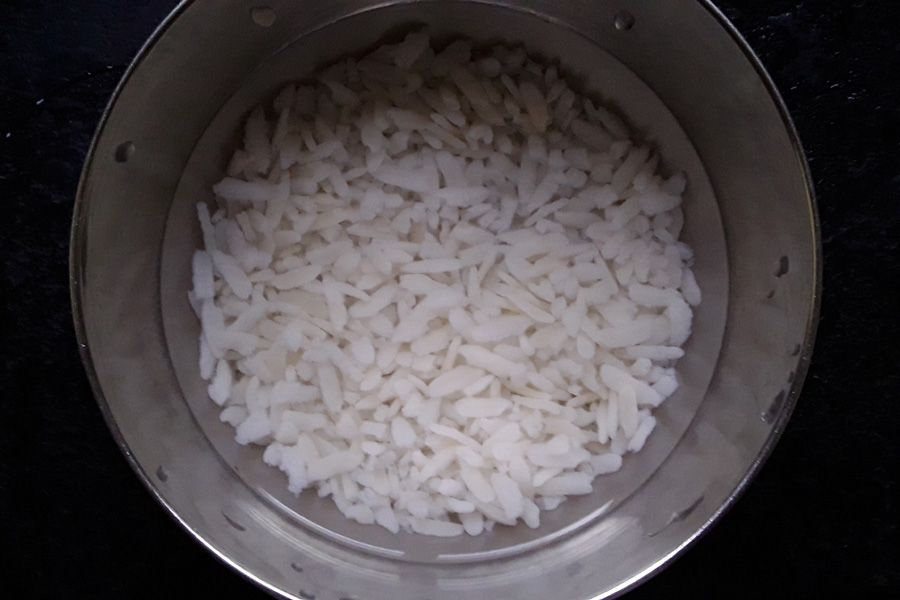 3. Take 1 tablespoon thick flattened rice (Avalakki / poha) in a bowl, rinse it 3 to 4 times or until clean and soak in enough water.