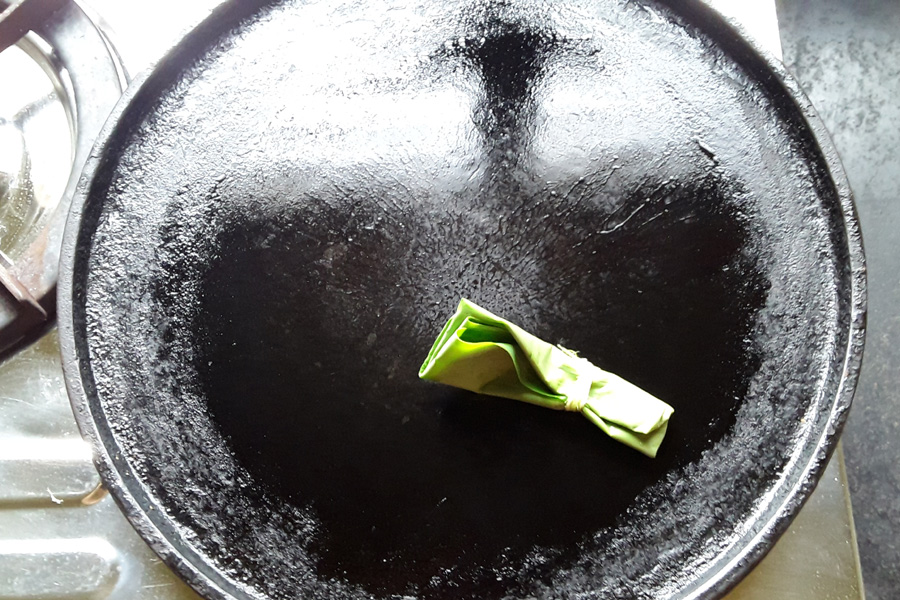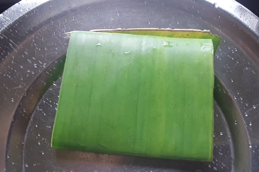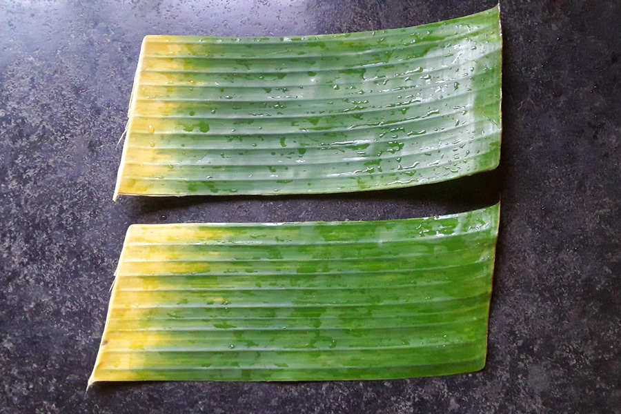 10. While the tawa is heating, take 2 long pieces of banana leaf and rinse thoroughly with clean water.