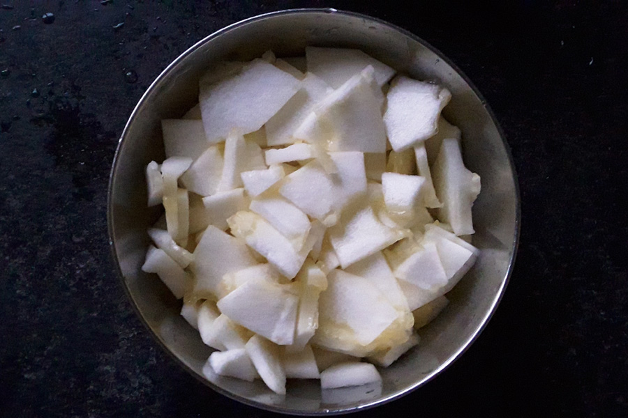 4. After 3 hours, chop Mogekaayi to thin slices. Tightly packed 1 cup is sufficient. It is fine if few pieces are less or more.