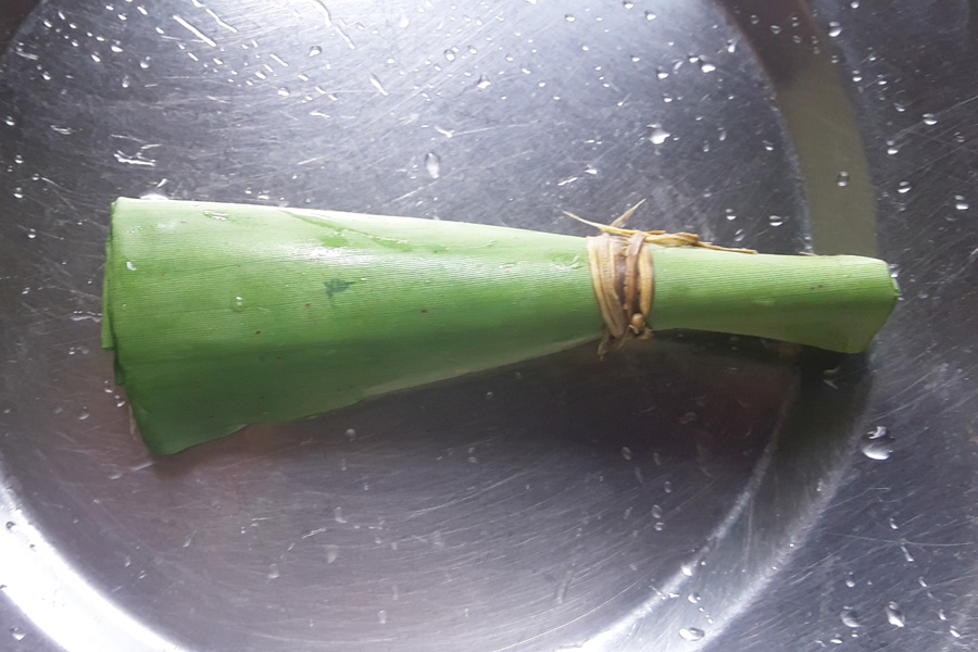 11. Take one long piece of banana leaf and make chutti. I.e. fold a piece of banana leaf and tie at one end.