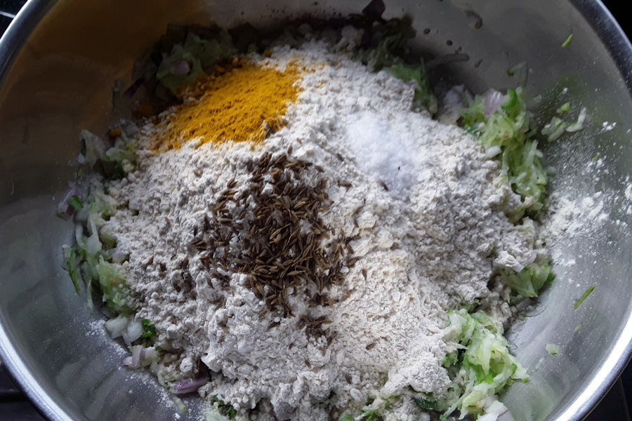 6. Add 1 cup sorghum (jola / jowar) flour, 1 teaspoon cumin seeds (jeerige / jeera), 1 teaspoon turmeric powder, and salt as required.
