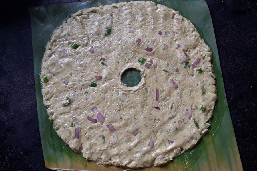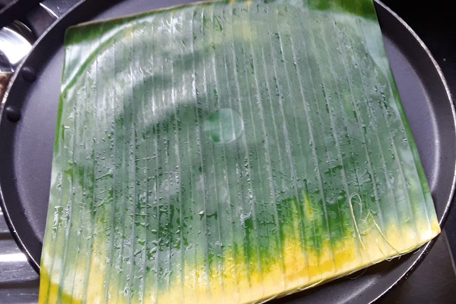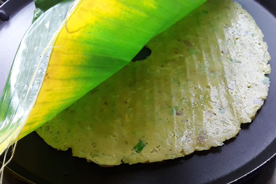12. Gently place the banana leaf with the taalipit side touching the hot tawa.
