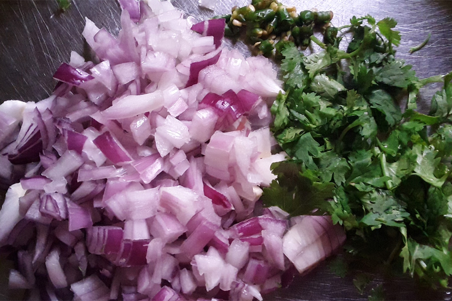 4. Rinse and finely chop onion, green chilli, and coriander leaves.