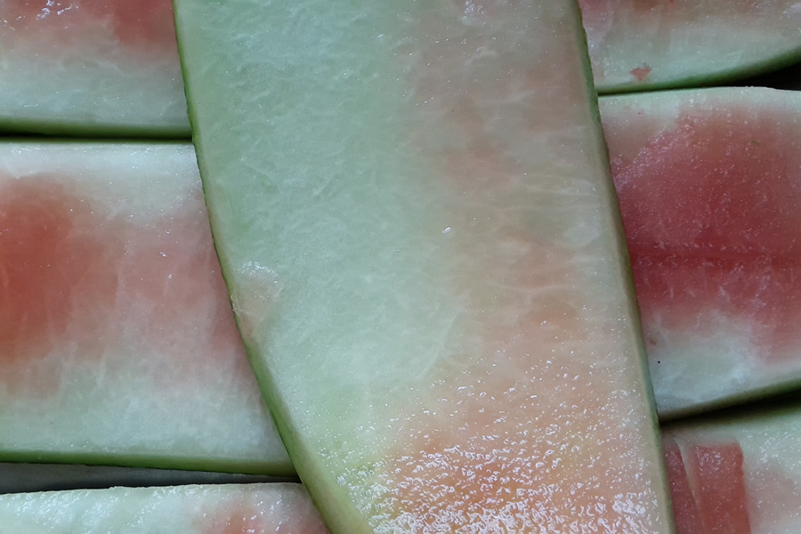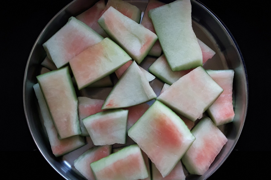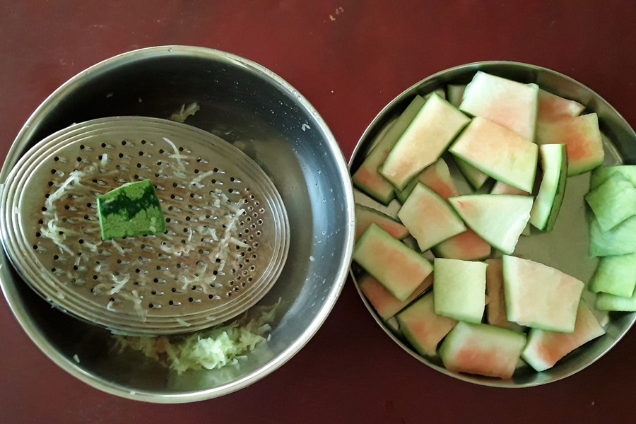 In this taalipit variation, watermelon white flesh or rind is used instead of cucumber. During watermelon season, usually watermelon rinds are not thrown after eating its pink or red pulp. Instead these rinds are used in dishes like tellevu, taalipit, etc., as this is off season for cucumber and mogekaayi.