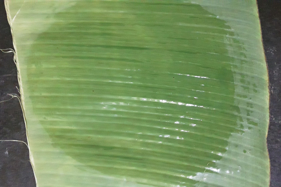 8. Take a piece of banana leaf and wash or clean it with wet cloth. Spread 2 drops of oil on the banana leaf. Also heat the tawa. Keep it on medium or high flame. Regulate the flame as required.