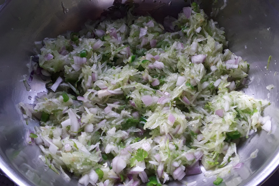5. In a bowl, mix grated watermelon rind, finely chopped onion, green chilli, and coriander leaves.