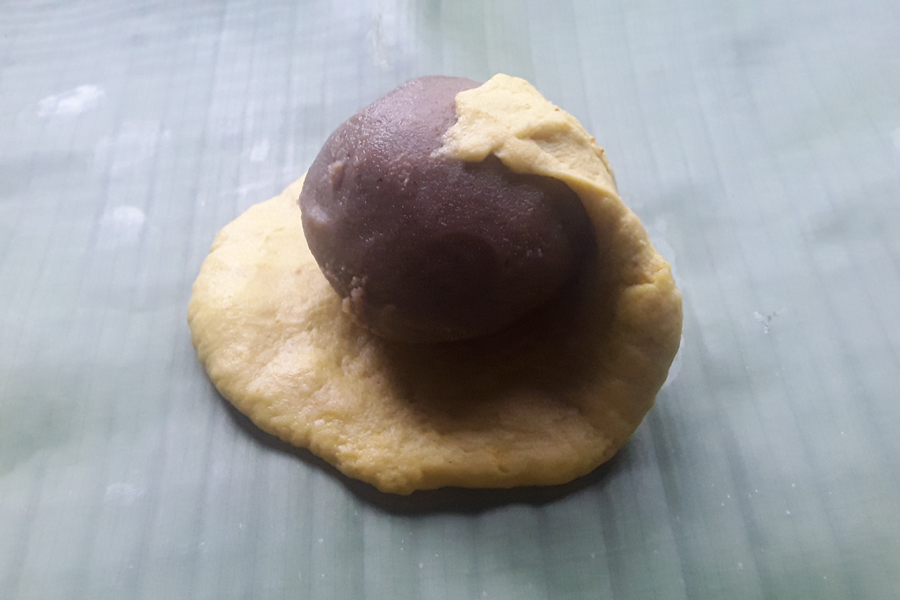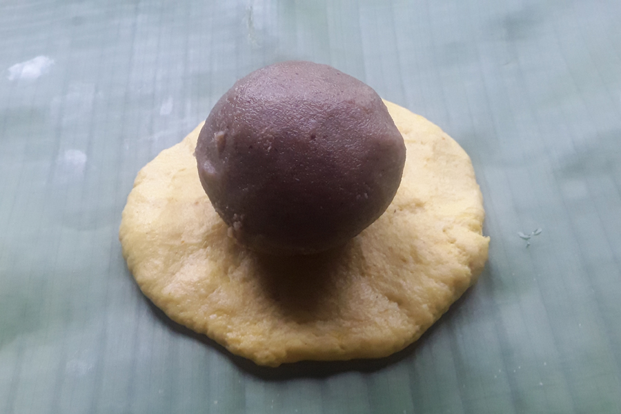 19. Take a small portion, half the quantity or little more than half of the stuffing ball, from the dough and roll it to a ball. Gently flatten with your fingers. Place the stuffing ball in the center of the flattened dough.