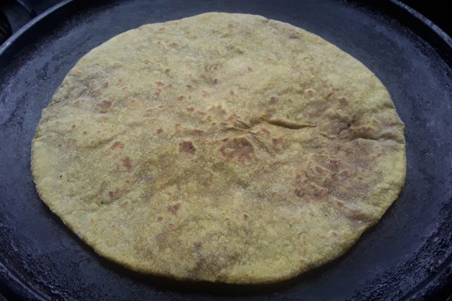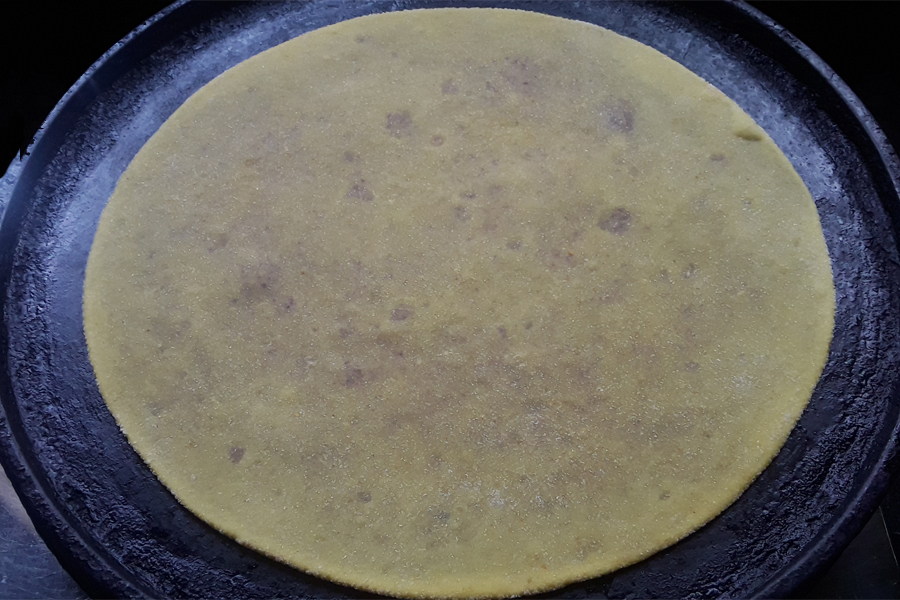 24. Heat a tawa on medium or high flame. Once heated reduce the heat to low. Regulate the heat as required while roasting Holige. Place the rolled holige on the tawa.