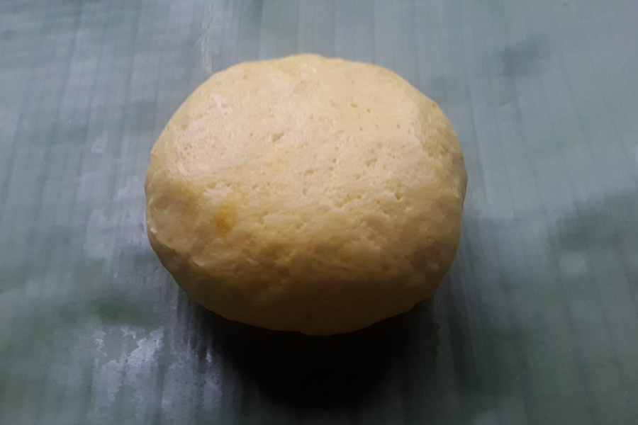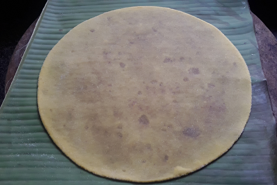 23. Now, take a rolling board and place a banana leaf piece which was cleaned and kept aside earlier.