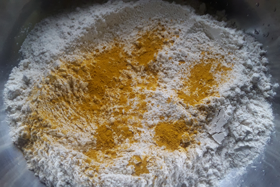 14. Take 250 grams whole wheat flour in a bowl. Add 2 teaspoons of turmeric powder. Add ½ teaspoon salt or as required. Mix well.
