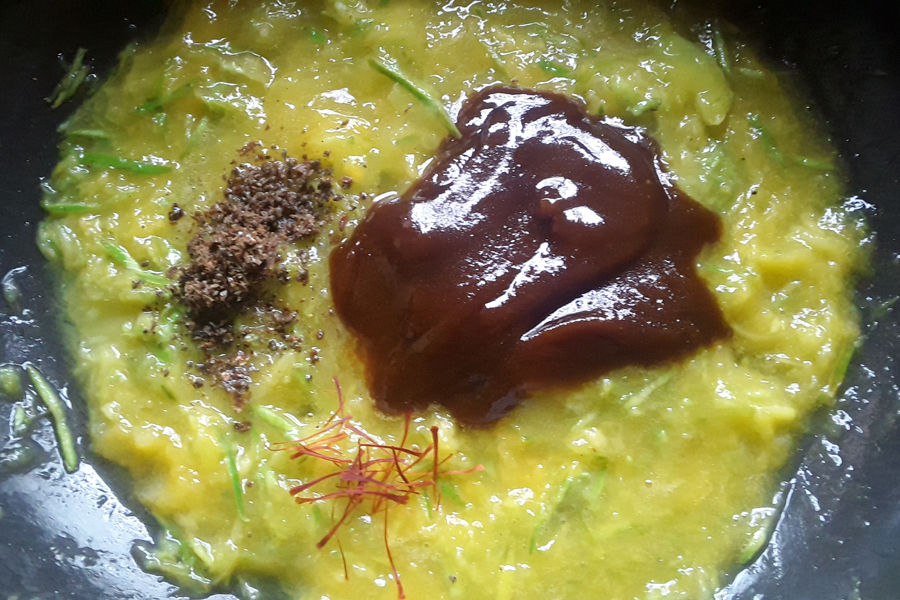 4. Add powdered spices, jaggery, and a few strands of saffron.