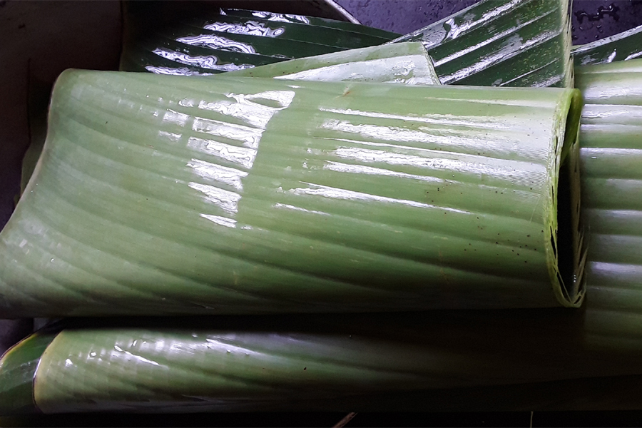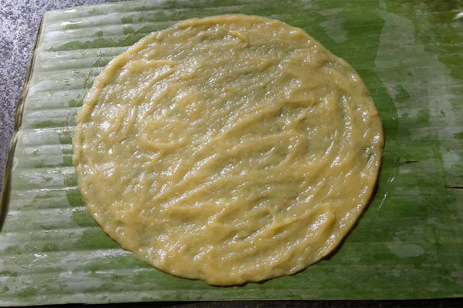 6. Take a banana leaf. Take a small portion of the jackfruit puree and put it on the backside of the leaf. With your fingers spread the puree to medium thick round shape.
