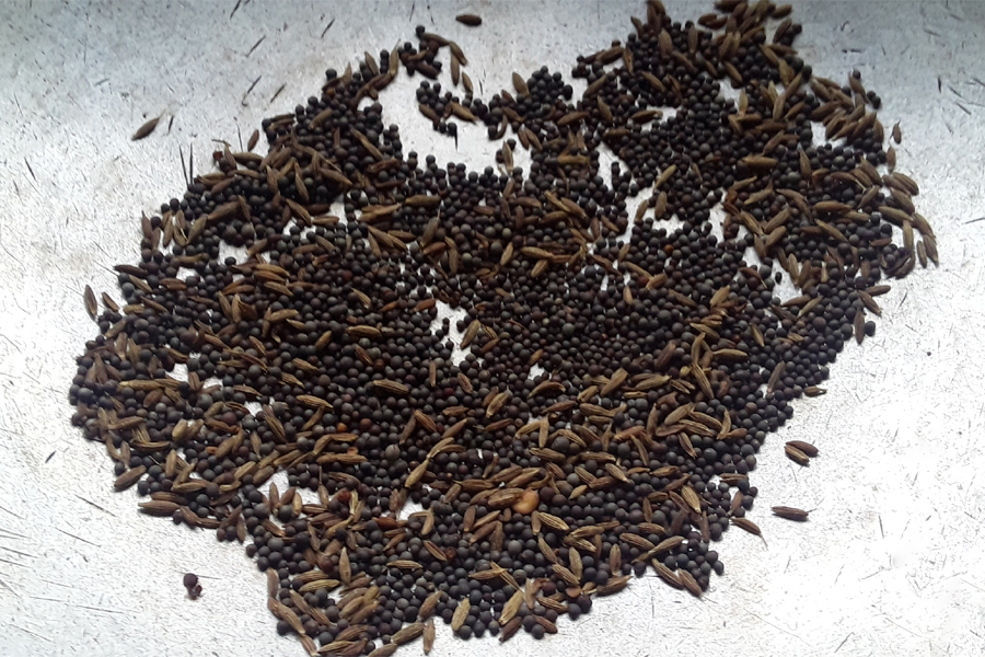 6. After 24 hours, dry roast mustard and cumin seeds until they splutter.