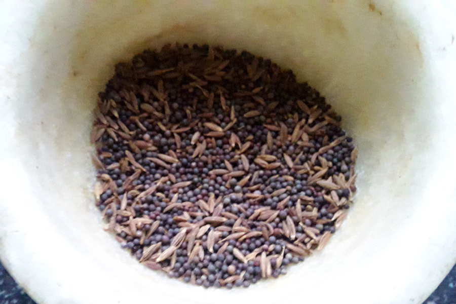 7. Now take all the roasted spices in a mortar. Powder them using pestle.