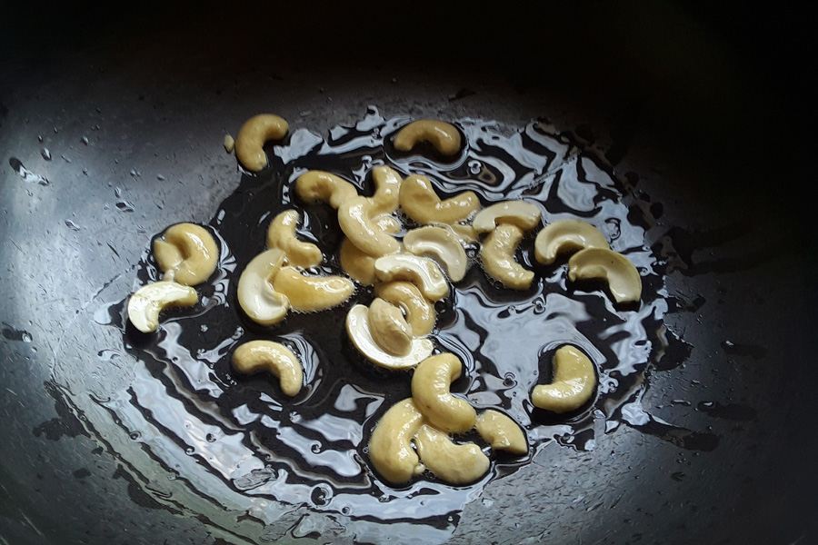 9. Heat 1 to 2 teaspoon of oil in a pan. Add 25g cashews and fry them till they become crisp. Stir continuously while frying.