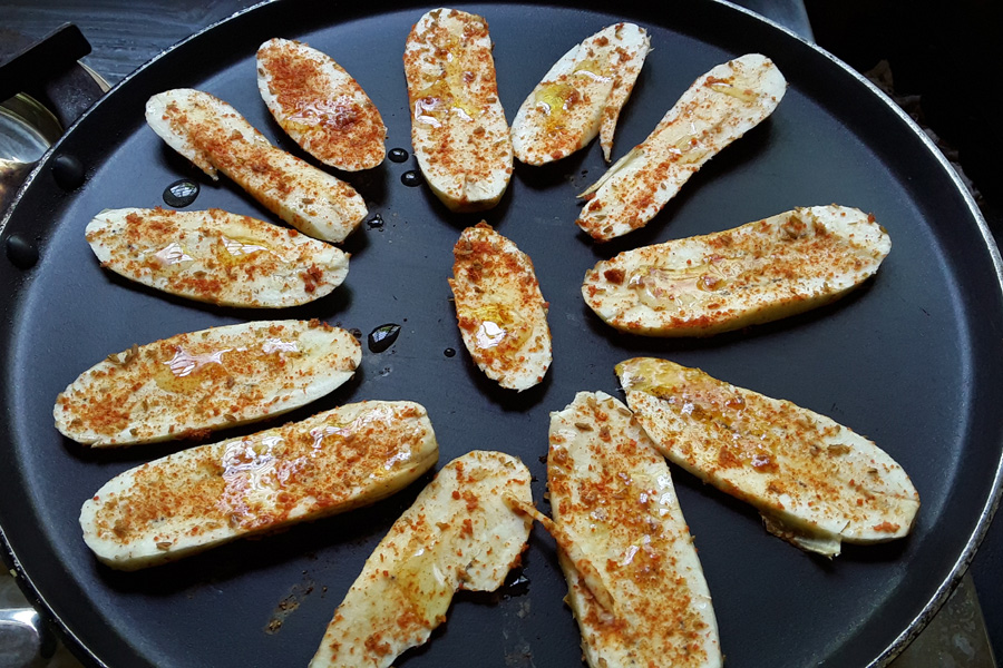 9. Heat a tawa or pan on a low to medium heat. Place the spiced banana slices on the tawa.